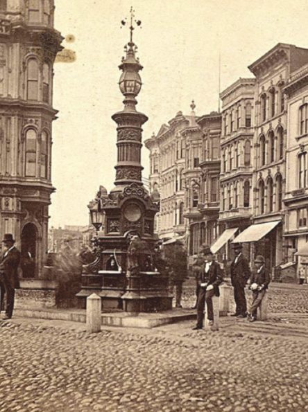 Following the storytelling program there was a ceremonial wreath-laying on the fountain, which dates to 1875 and was a significant meeting point in the aftermath of the earthquake and fire. “Lotta” refers to the actress Lotta Crabtree (1847–1924), who originally commissioned the fountain. Crabtree never married, often donned male attire, and was one of the wealthiest and most beloved entertainers of her time. (Her final public appearance was in 1915 when she came out of retirement to appear at Lotta Crabtree Day in San Francisco.)