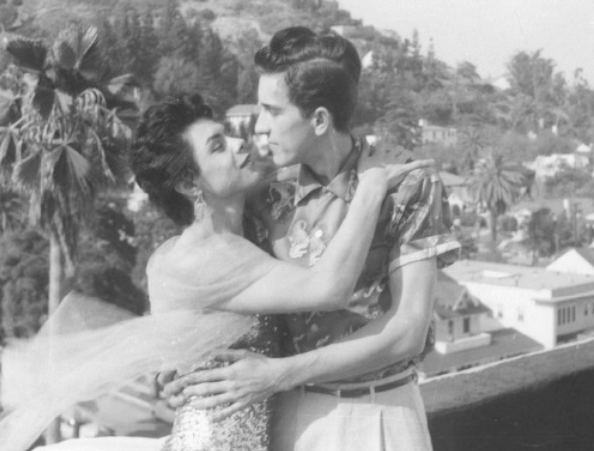 Victoria Fernandez posed in profile with a companion, with a landscape of palm trees in
