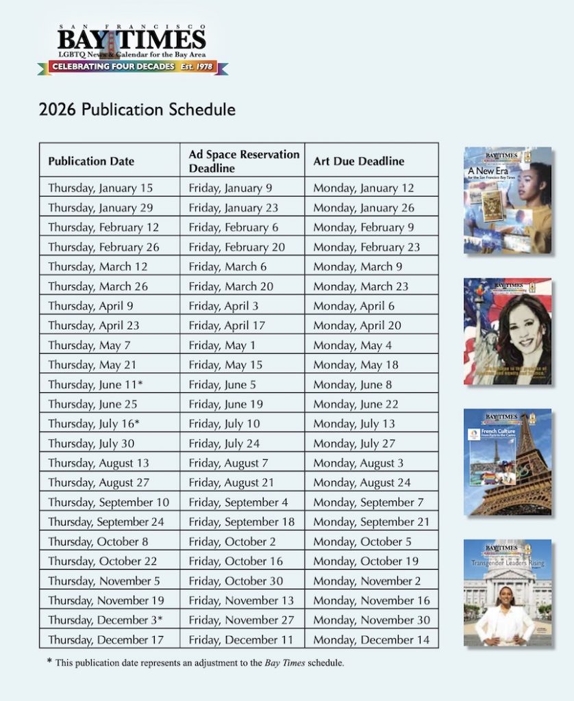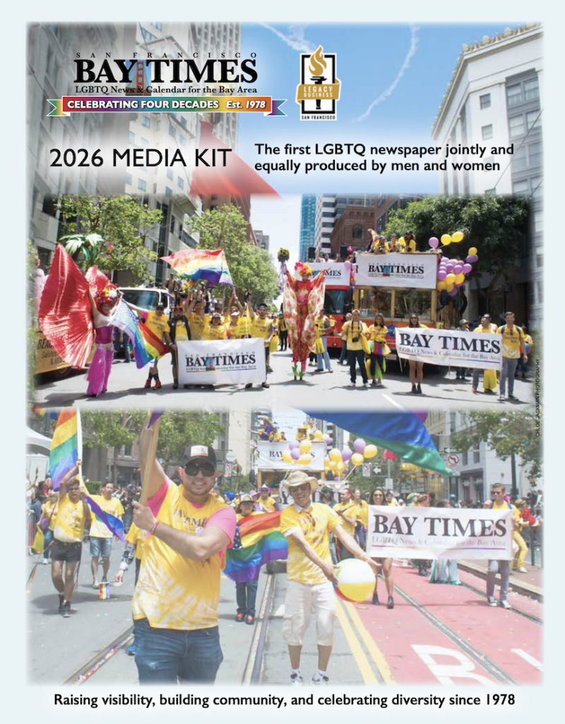 Download the 2026 San Francisco Bay Times Media Kit (PDF Document) Please request the Advertising Rate Sheet by contacting: Publisher@sfbaytimes or calling 415-601-2113.
