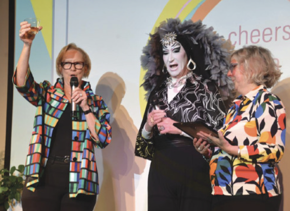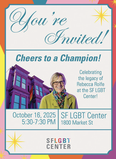 Rebecca Rolfe, the Executive Director of the SF LGBT Center for 22 years, was celebrated at the event Cheers to a Champion at the center on October 16, 2025. Rolfe, who announced her retirement early this year, has been one of the most successful nonprofit leaders in the city’s history, having spearheaded numerous programs and other initiatives benefiting all facets of the LGBTQ+ community. They include the center’s offerings concerning employment and financial services, housing resources, arts and culture programming, and specialized support for youth and trans communities—several of which were the first of their kind in the nation.