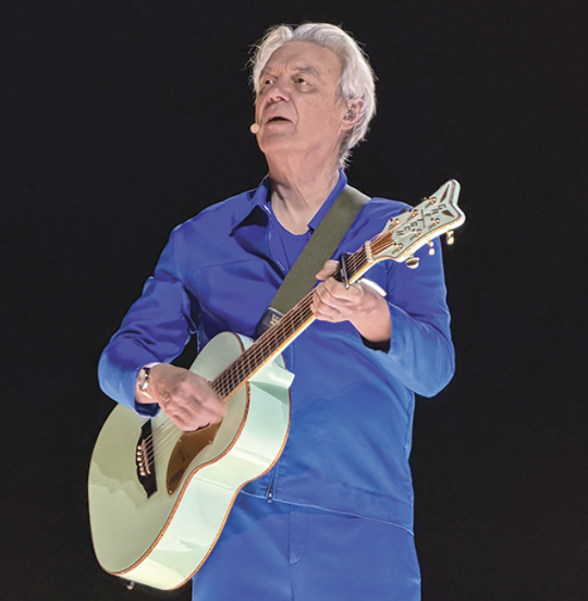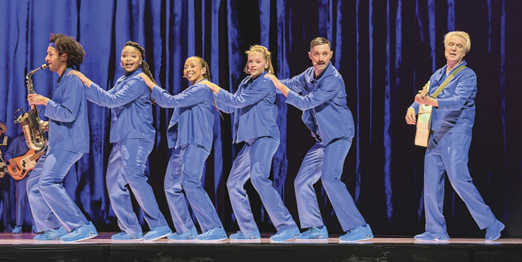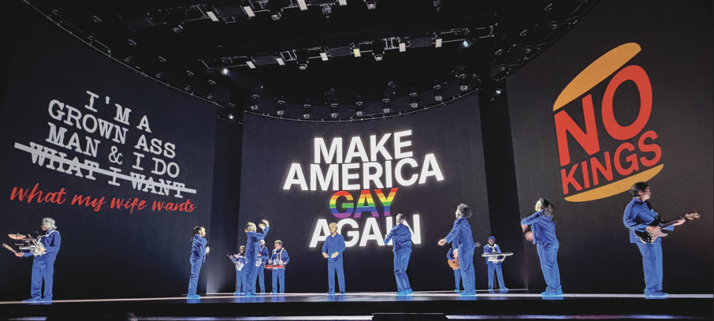 Published on December 4, 2025 Former Talking Heads frontman David Byrne and a 12-member band performed a three-night stint at the Bill Graham Civic Auditorium in San Francisco starting on November 16, 2025. An avid cyclist, Byrne at age 73 was a whirlwind of energy on stage. Also evident was his support of the LGBTQ+ community. At one point, the stage lit up with the statement, “MAKE AMERICA GAY AGAIN” on the central panel of a three-part massive curved screen. There was also a “NO KINGS” image displayed during the evenings that combined music with striking choreography and high-tech visuals.