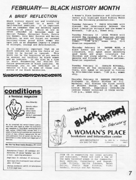 Standout pieces include “Journal Entry: Reminders” by Lucille Hunt (1984) and “Lesbianism Is a Reality” by Tania Abdulahad (1983), as well as a brief essay marking February as Black History Month.