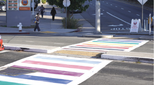The first permanent rainbow crosswalk was installed in 2012 on San Vicente Boulevard in West Hollywood, California. Since then, dozens of cities across the nation and around the world have commissioned local artists to create similar tributes to the LGBTQ+ community. Here in the Bay Area, San Francisco was the first to install multiple permanent rainbow crosswalks in 2014, followed by San Jose in 2016, and the city of San Leandro installed their permanent rainbow crosswalk in 2019.
