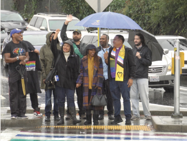 The Lakeshore LGBTQ Cultural District and the Oakland LGBTQ Center on November 13, 2025, unveiled an historic new rainbow crosswalk. The occasion was marked with a ceremonial ribbon-cutting ceremony and walk. The center’s Co-Founders Joe Hawkins and Jeff Myers, Oakland Mayor Barbara Lee, iHeart Radio DJ Christie James, the Oakland Gay Men’s Chorus, The Pied Piper, community leader Lisa Williams, and many other local leaders and allies were present.
