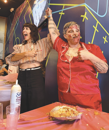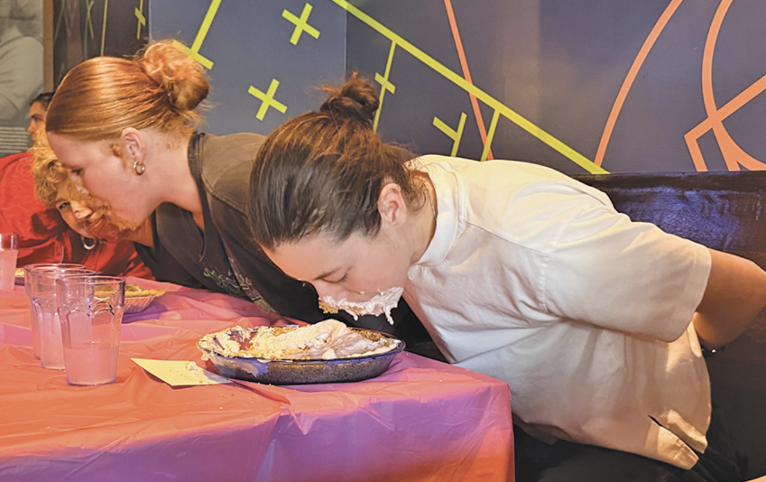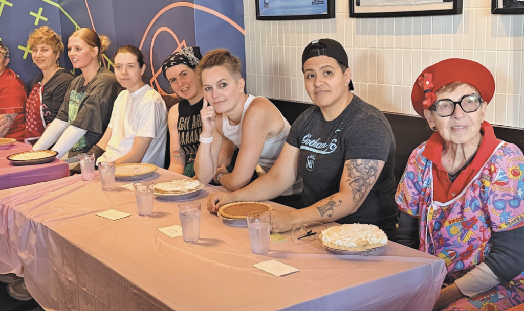 The Curve Foundation hosted a Lesbian Pie-Eating Contest at Rikki’s in the Castro on November 23, 2025. Contestant Jenn was the winner. She raised her tattooed arms in victory after she expertly dove into her fruit pie. Babs Daitch, in turn, was declared the contestant with the “Best Technique.” At 81 years old, Daitch made international news following the posting of videos of her at the contest. Giving new meaning to “food porn,” she later wrote of the experience, “I took my time savoring every morsel of crust hidden beneath those sweet hills and valleys.” Watch Daitch go at it in the clips shared by Them at: https://bit.ly/48wwrhZ