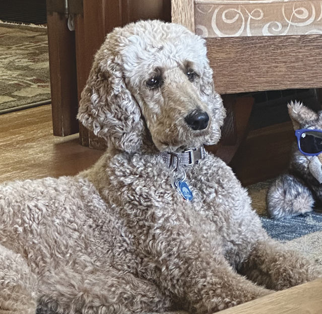 So, two years ago we adopted what we thought would be a medium-sized dog, but she’s currently sixty pounds and as strong as a dray horse. A standard poodle, she’s affectionate, smart, and I’m pretty sure she speaks three languages: English, French, and ASL.