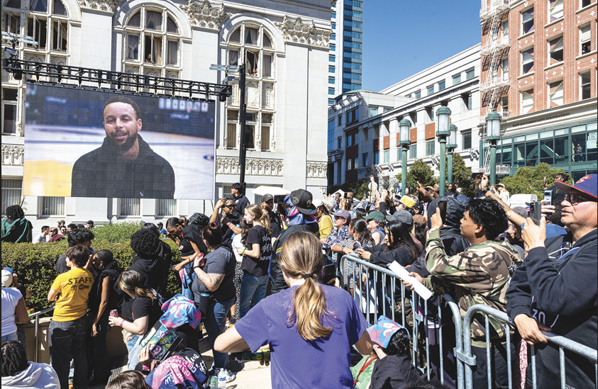 Golden State Warriors’ Stephen Curry, projected on the big screen, delivered his