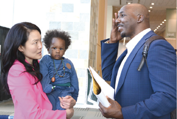 Candidate and former SF Supervisor Jane Kim holding a child and with a constituent at the 2026 CADEM Convention