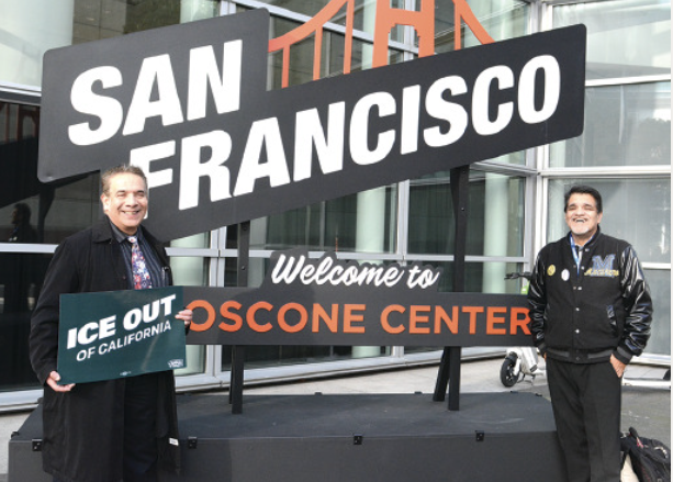 Anti-ICE activists in front of the 2026 CADEM Convention at the Moscone Center