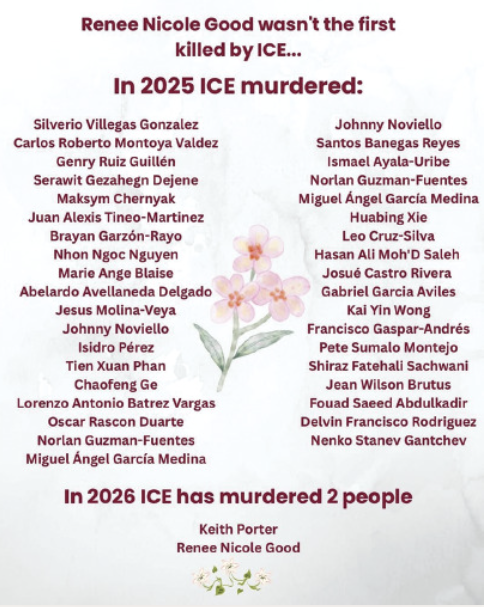 But The Transgender Law Center, two days after the shooting of Renée Nicole Good on January 7, 2026, reported that ICE has “murdered” at least 39 individuals since 2025. Accompanying the graphic listing the names was this statement: